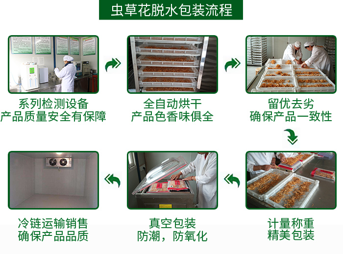 湘蕈虫草花从栽培原料检测入库、鲜菇采收、修脚、脱水烘干、包装、出厂检测,到运输配送,注重每一个环节,确保产品质量安全。