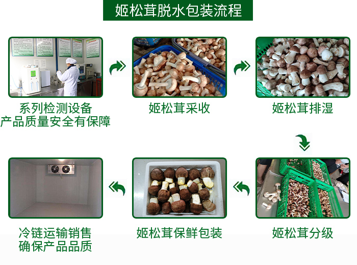 姬松茸鲜货经低温排湿后,保鲜包装,低温冷链储运,防腐烂霉变、保质期长。